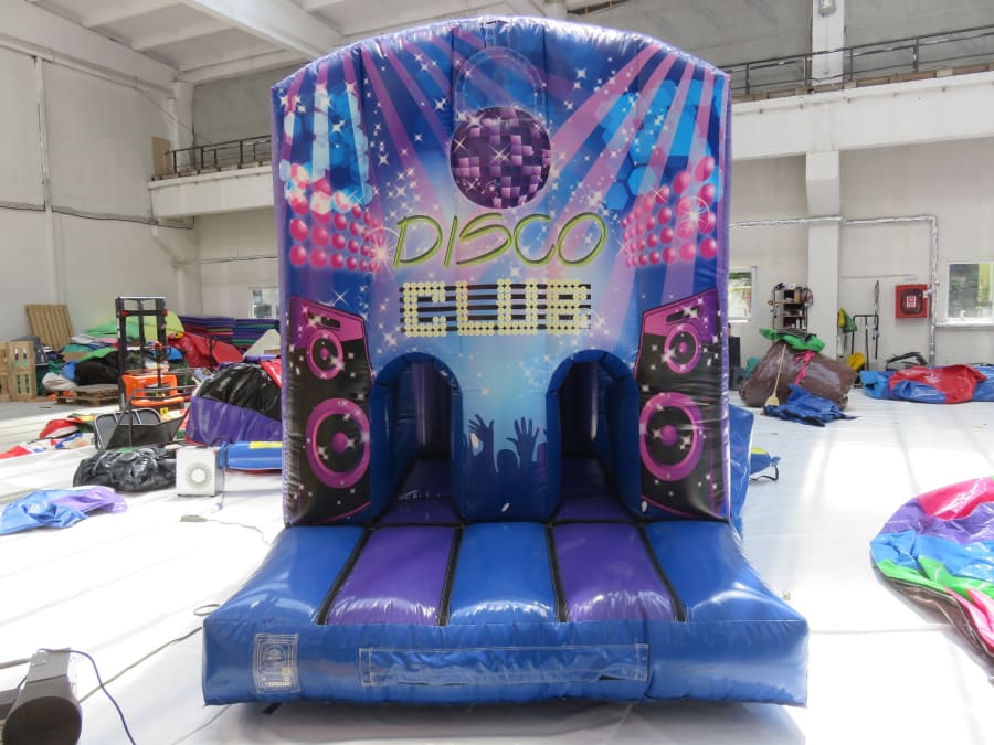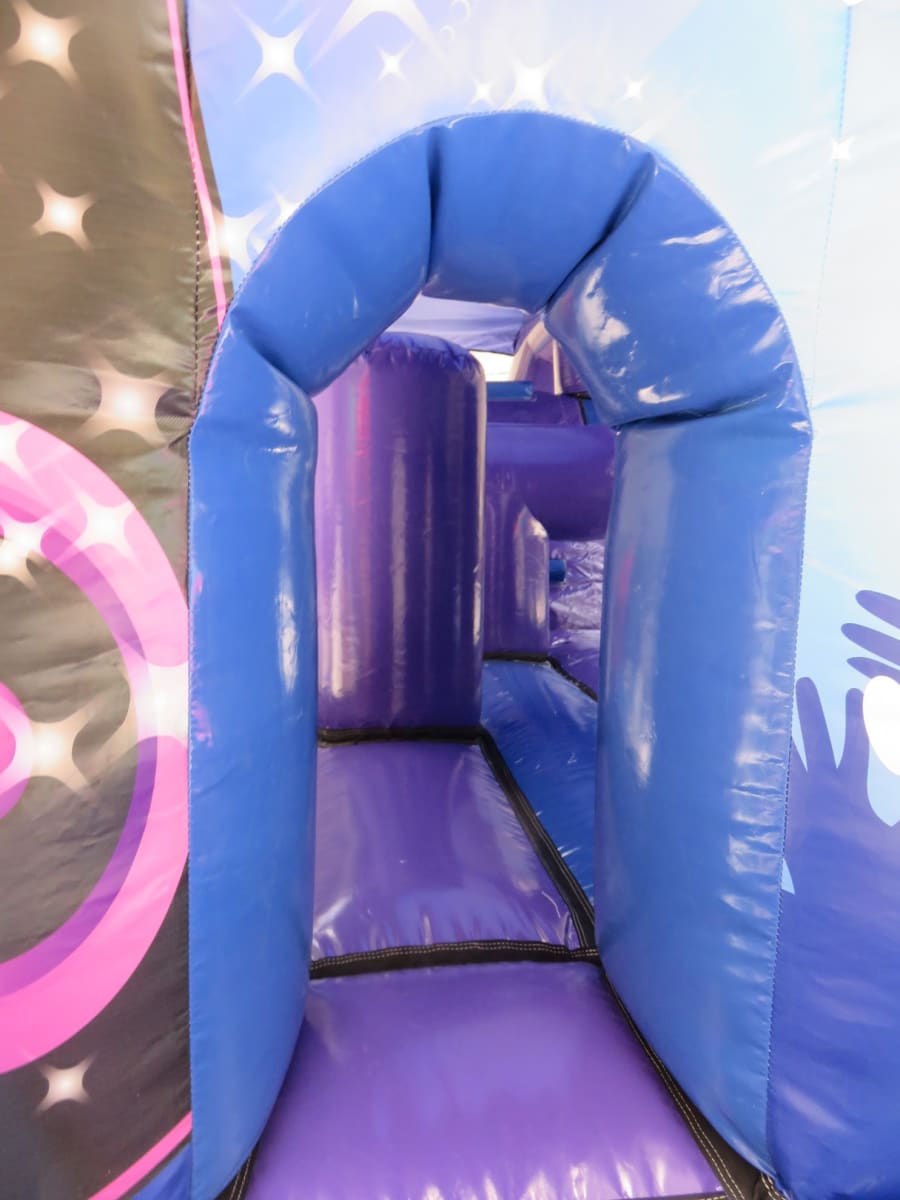 Bourne Bouncy Castle Hirer now have in a Disco Fun Run ...A great hire for a larger party....This can be used indoor venue or can be used outdoor garden party hirer. Size of space needed is 26 ft long x 15 ft wide x 12 ft tall. This disco fun run comes delivered with Disco music and lights ..you can then download your own music via blue tooth.. A perfect hire every time. This also comes with a shower cover for outdoor use in light shower / rain. Netted sides to see all the action and fun. Two entrance arches, biff bash jump, large block step , slide out slide...Will keep the kids entertained all day.