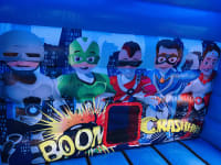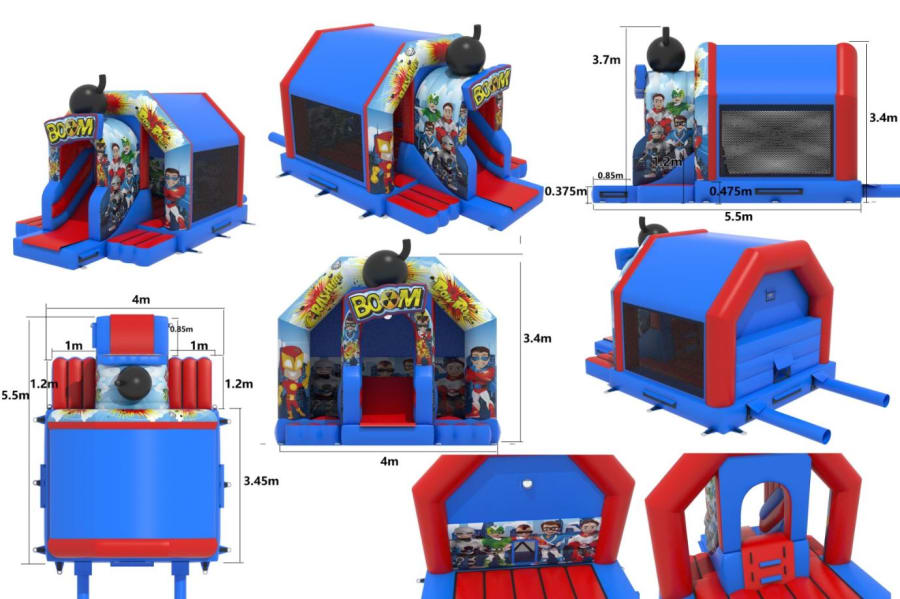 The slide measures a whopping 4ft yet is perfect for both indoor and outdoor hire . The art work theme is very realistic and fantastic quality. This combo castle has features such as firm steps holds, extra handrails and a shower cover roof to stop over adventurous super hero's climbing out ensuring maximum safety.