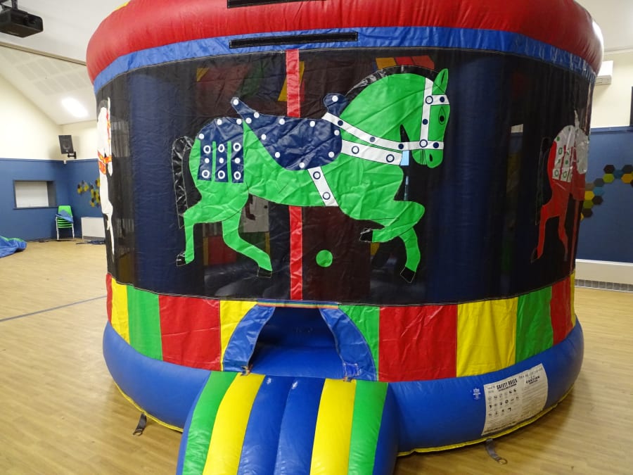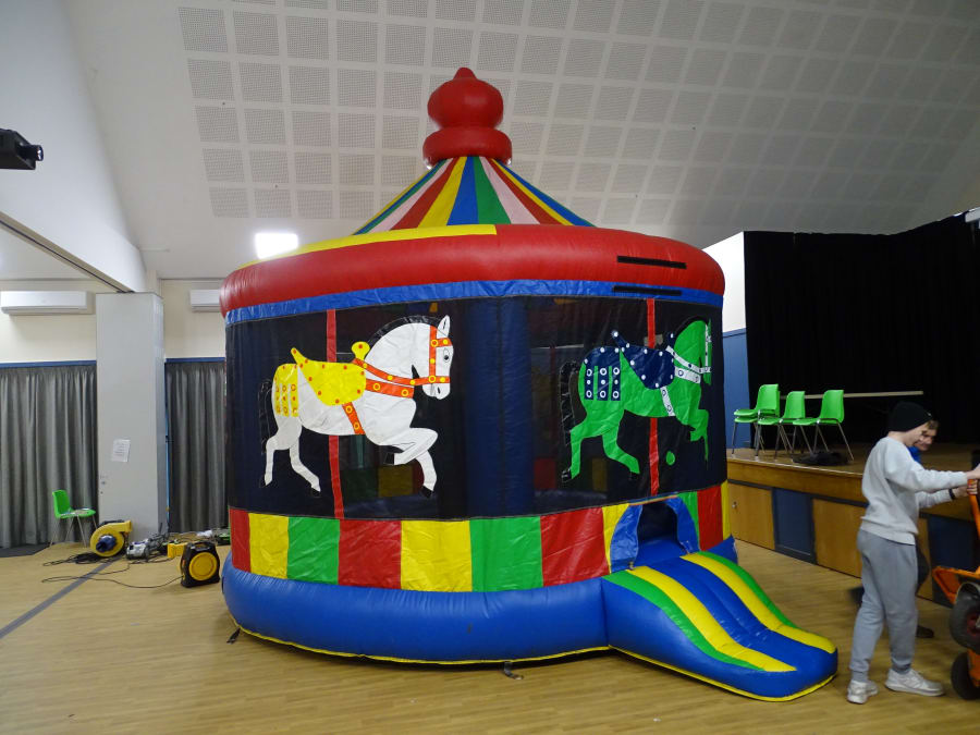 ROUND CAROUSEL ..16ft round . ONE OF THE BEST HIRE WE DO , personal favourite of mine always popular . May pole top with shower cover . Kids love them ,look good in garden . safety net around slip side out front . NUMBER ONE FOR PRIVATE HIRE . can be in hall if you can find one big enough.
