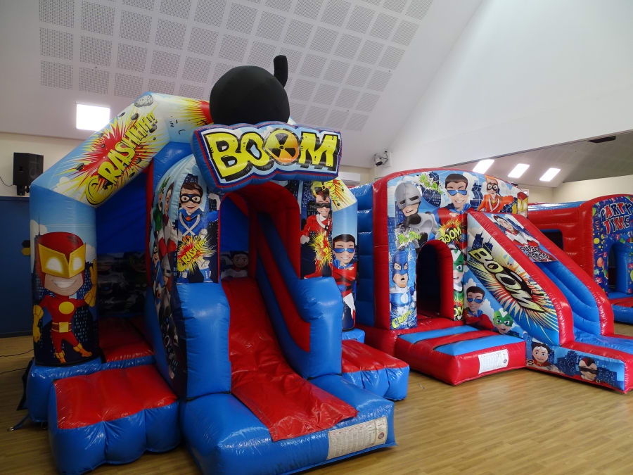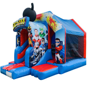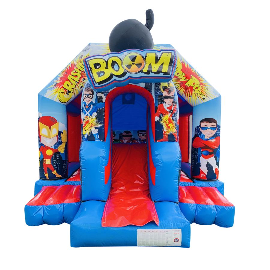 Super Hero ..Bounce and Slide ..NEW in stock 2021 .. A fantastic 3D art work ..Perfect for all your little supper Heroes ...Great size 18.5ft x 13.5 ft x 13ft high ..Mega good looking ..Large front slide 4.5FT ..loads of fun for all the family ..Comes with shower cover ..A must for a large garden party hire ...