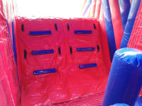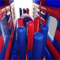 Super Hero Assault Course incorporates an up and over slide , biff and bash with bouncy area , hurdles, whackers, biff / bash post, mini humps, crawl through tunnels ..and more ..The inflatable assault course offers a safe entrance way with full theming , followed by random series of obstacles.